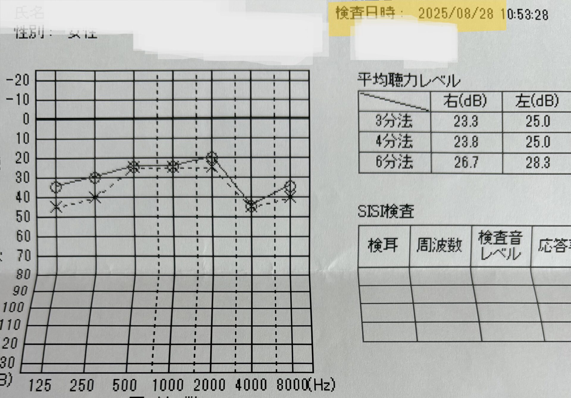 末尾に、左耳(×印)の聴力検査結果を表にしました。診察時に耳鼻科の先生がみているのは「平均聴力レベルの4分法」です。500Hz~2000Hzの聴力は、会話をききとるのに最も重要だからです。125Hzと8000Hzは環境音(身の回りの音)となります。ただ、楽器を演奏されていますので高音域の8000Hzが両耳共に60㏈→40㏈へ治っていることがとても嬉しいのと驚きです。このままキープしていただきたいです。8月28日現在の聴力検査結果では、500Hz、1000Hz、2000Hzの全てが25dBで正常値、左右差もなくなり治っているので電話での会話もきこえます。
