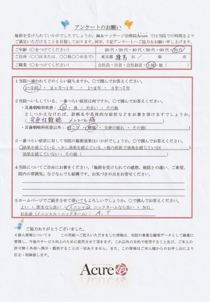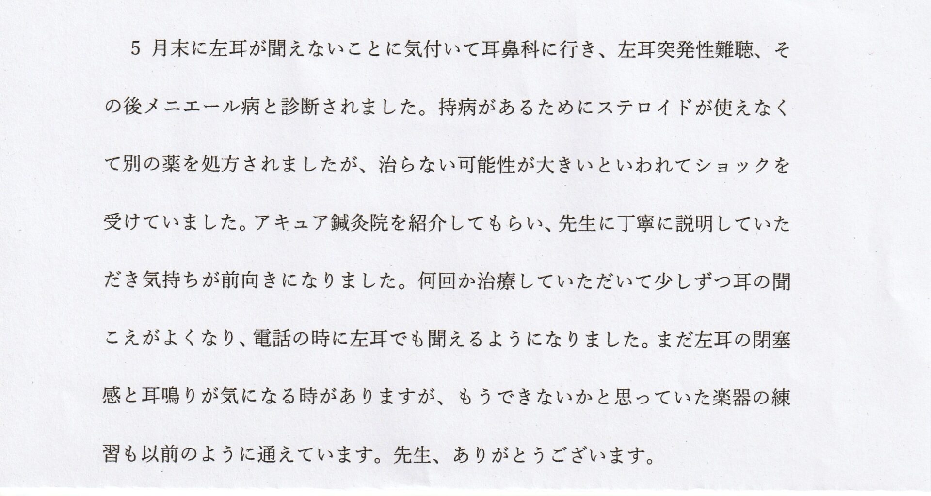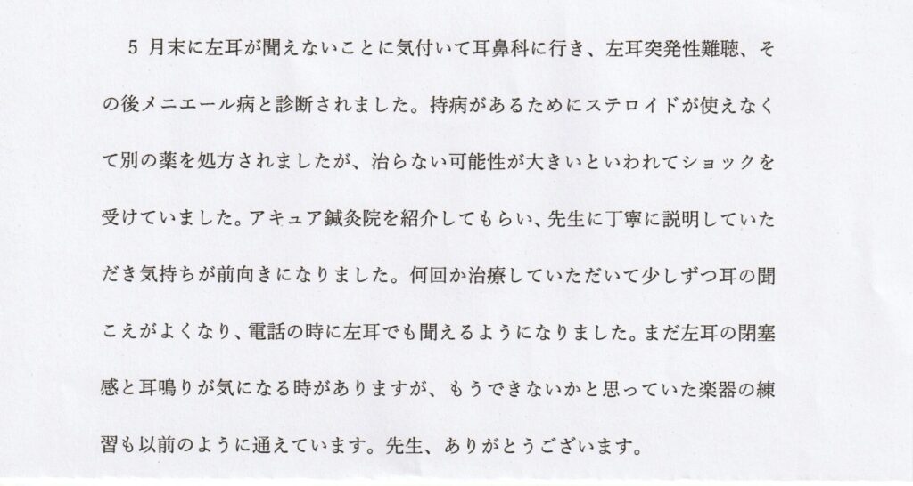 アキュア鍼灸院を紹介してもらい、先生に丁寧に説明していただき気持ちが前向きになりました。何回か治療していただいて少しずつ耳の聞こえがよくなり、電話の時に左耳でも聞えるようになりました。
